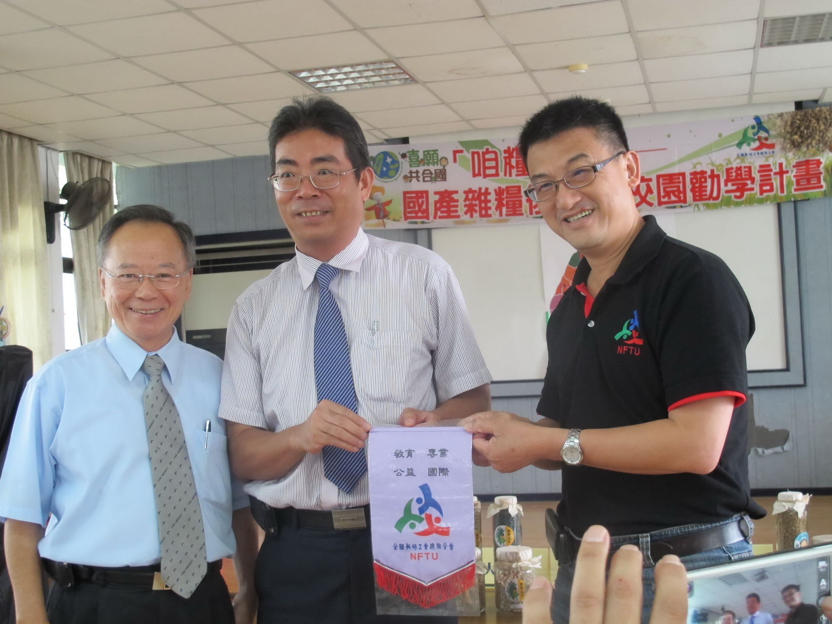 由左至右依序為:台南市政府教育局鄭邦鎮局長、台南市官田國小林保良校長、本會劉欽旭理事長。