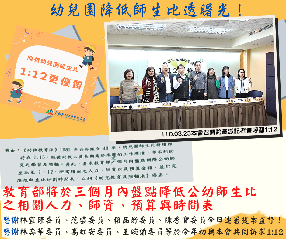 今日林宜瑾委員、范雲委員、賴品妤委員、陳秀寶委員,於立法院中臨時提案,協助督促本會今年初所關心降低師生比議題,並要求教育部應盡快規畫相關措施,會中討論後,教育部承諾將於三個月內,盤點調降公幼師生比至1:12所需增加之人力、師資以及預算金額,並訂定降低師生比計畫時間表,以利幼照法之修正!