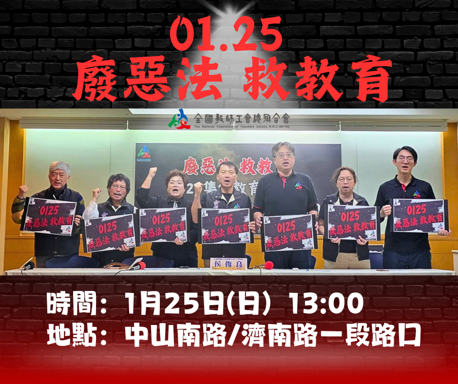 全教總嚴正宣告:將於1月25日協同全國各地方教師工會,號召全國教師夥伴走上街頭,前往教育部進行陳抗,控訴教育官僚凌遲中小學教育現場,要求政府停止「小案大辦」,還給校園平靜的教學空間。